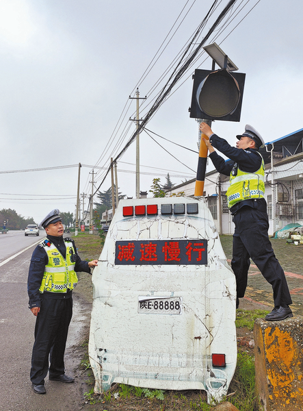 民警仔细检查维护310国道沿线交通警示设备。通讯员 张英 摄