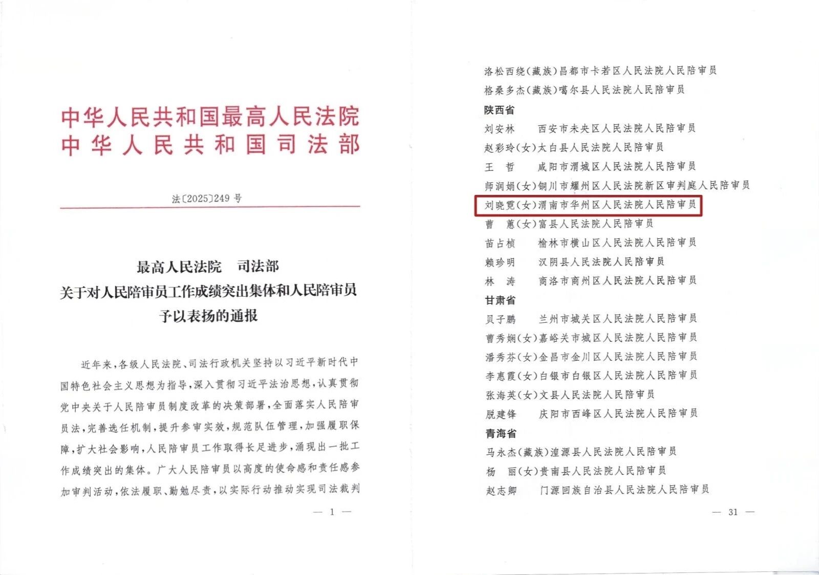 近日,最高人民法院、司法部印发《关于对人民陪审员工作成绩突出集体和人民陪审员予以表扬的通报》,华州区法院人民陪审员刘晓霓被通报表扬为“工作成绩突出的人民陪审员”,为渭南市唯一获此殊荣的个人。