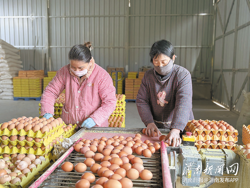 走进养鸡场,现代化的养殖气息扑面而来。中央集蛋系统正高效运转,一枚枚新鲜的鸡蛋通过传送带源源不断地输送到分拣区。控制台前,几名工人正娴熟地对鸡蛋进行分拣、装箱、搬运,每一道工序都有条不紊。“家门口就业,既能照顾家庭,又能赚钱,挺好的。”正在忙碌的张玉萍脸上洋溢着满足的笑容。